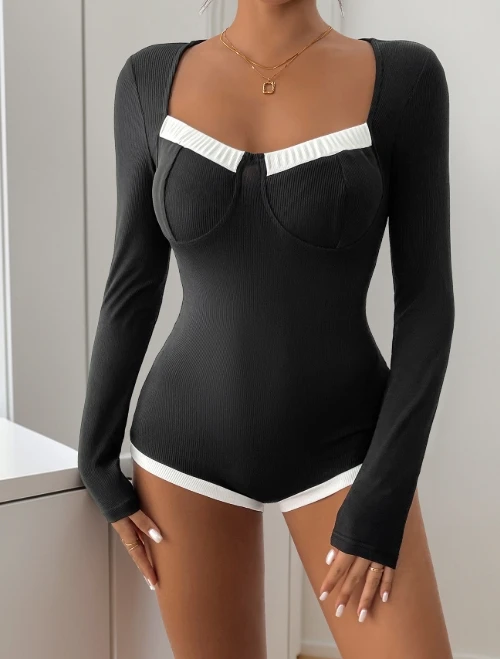 Sexy Bodysuit Women 2025 Spring Fashion Color Blocking Square Neck Long Sleeved Casual Knitted High Elasticity Bodysuit Y2K Tops