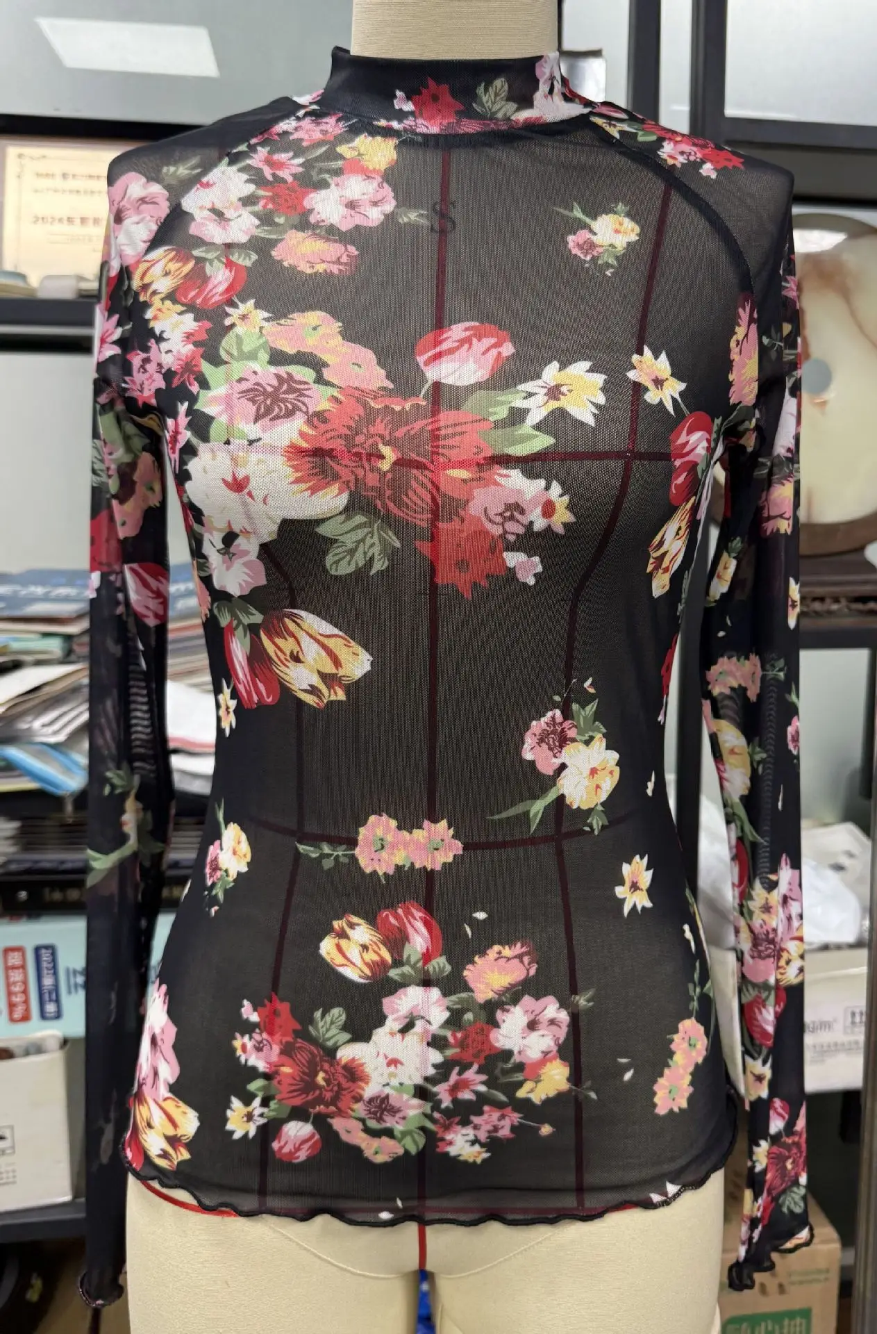 Be the first to review “Women Top Mesh T Shirt Base Layer Flower Print Half High Collar Stretch Sexy Sheer Slim Basis Tops Tees Autumn Office Lady”